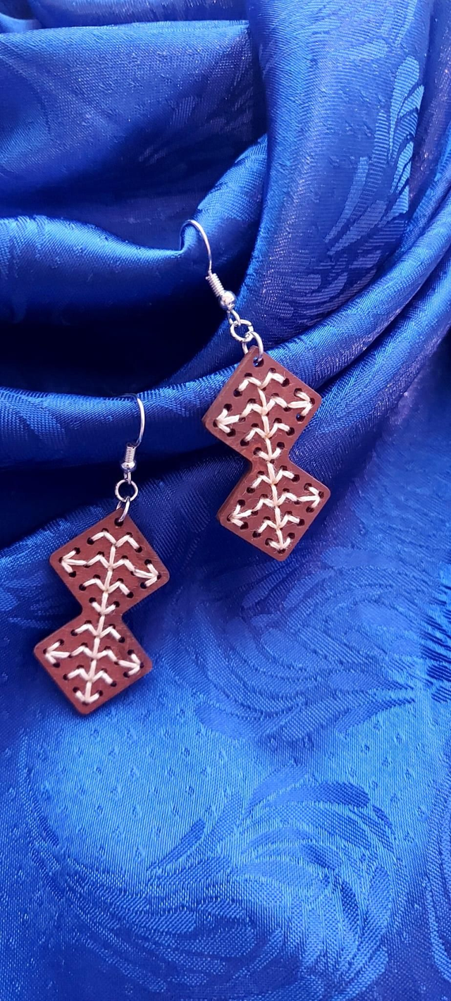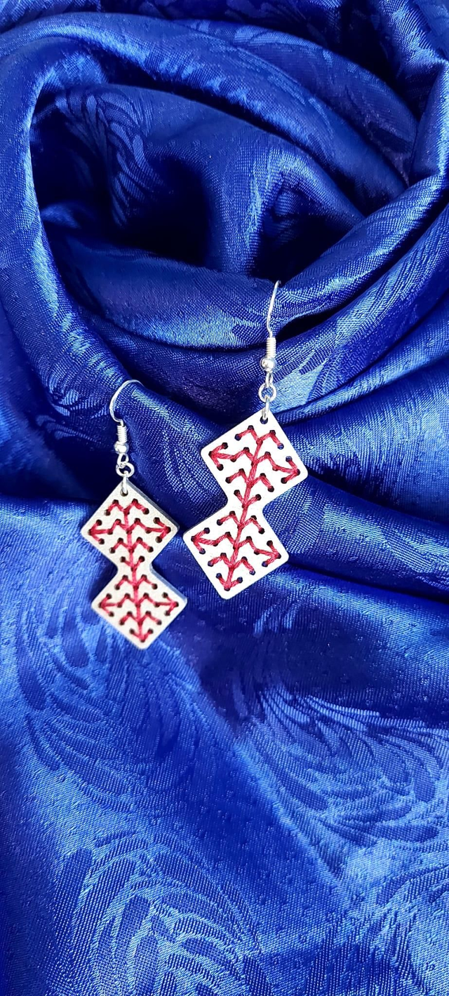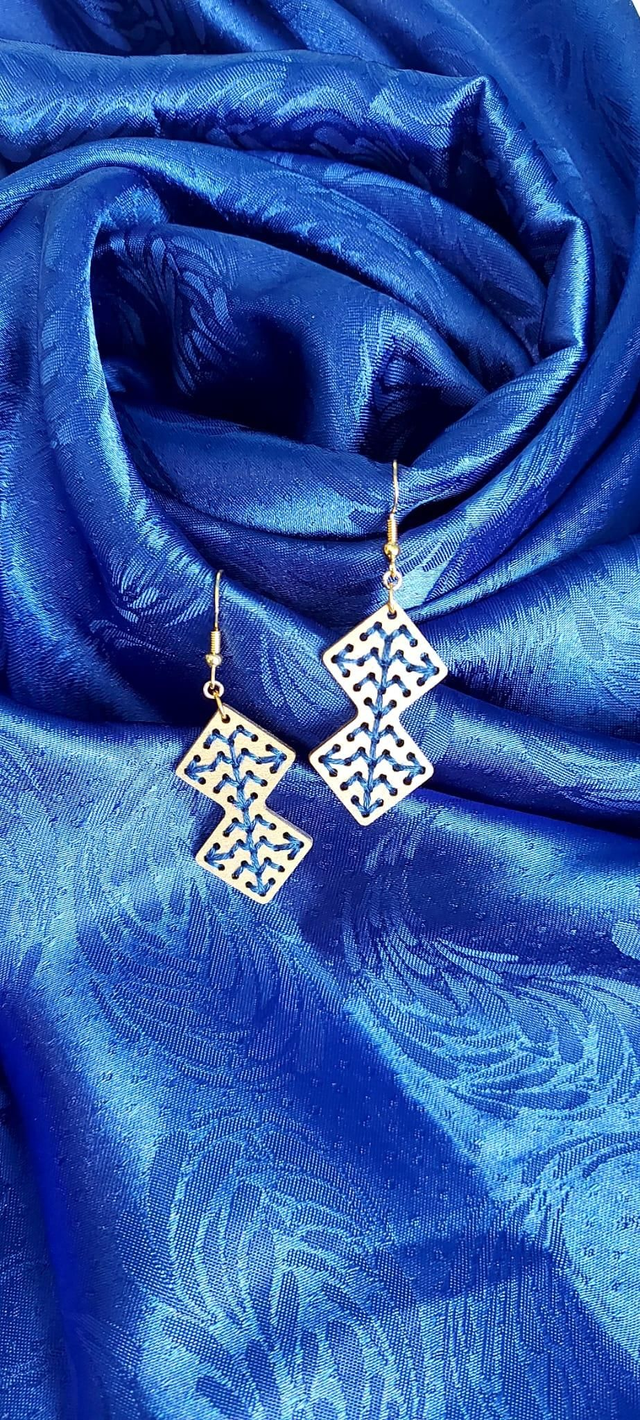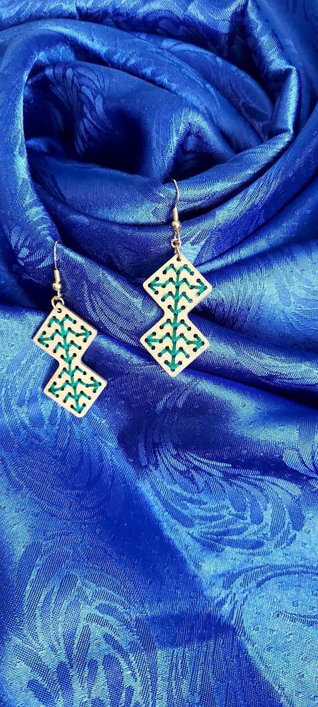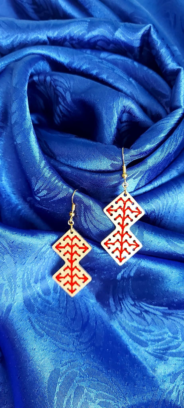 Boucles d'oreilles en bois de tilleul brodés de fil 100% coton, crochets argent 925.